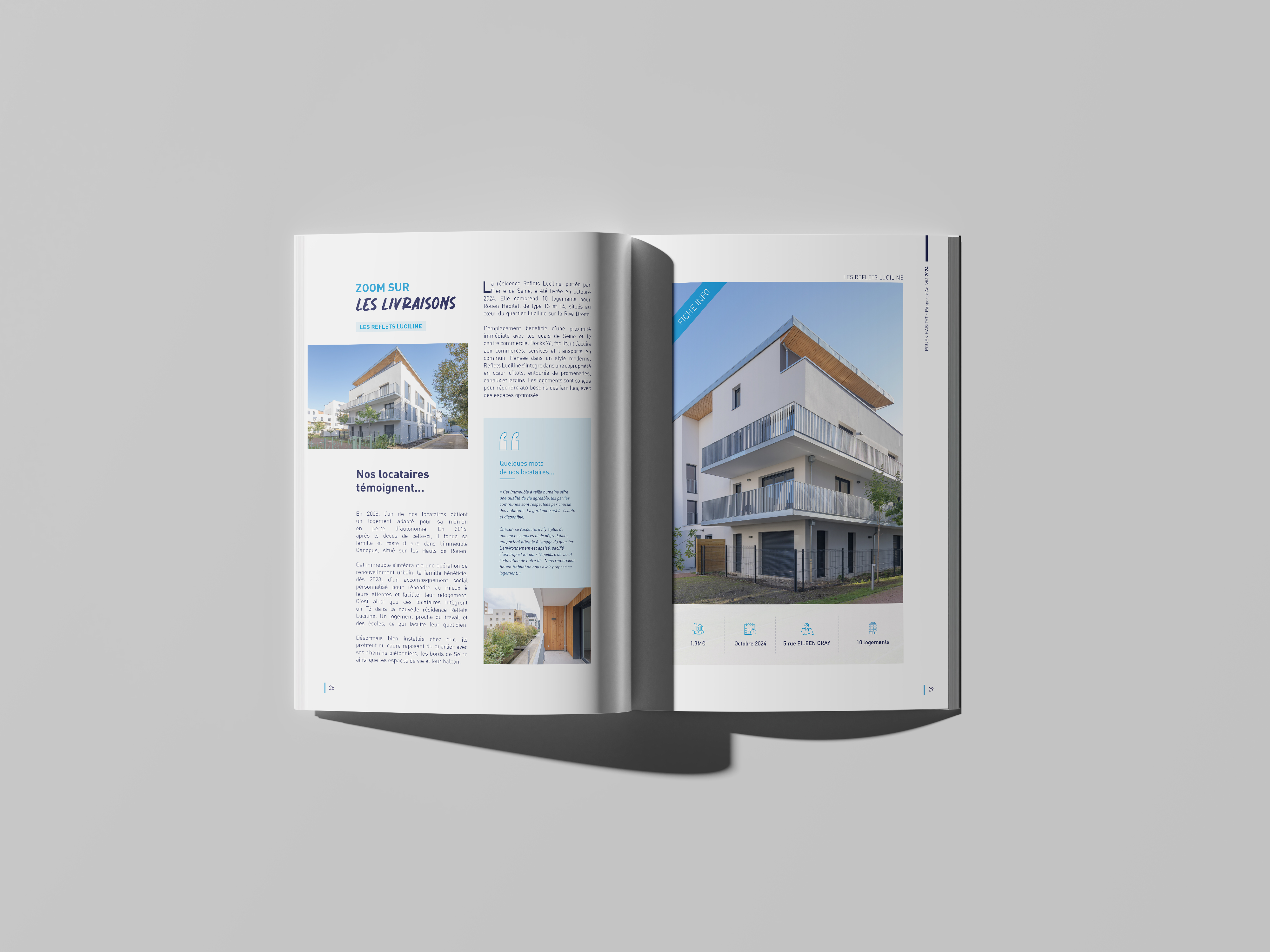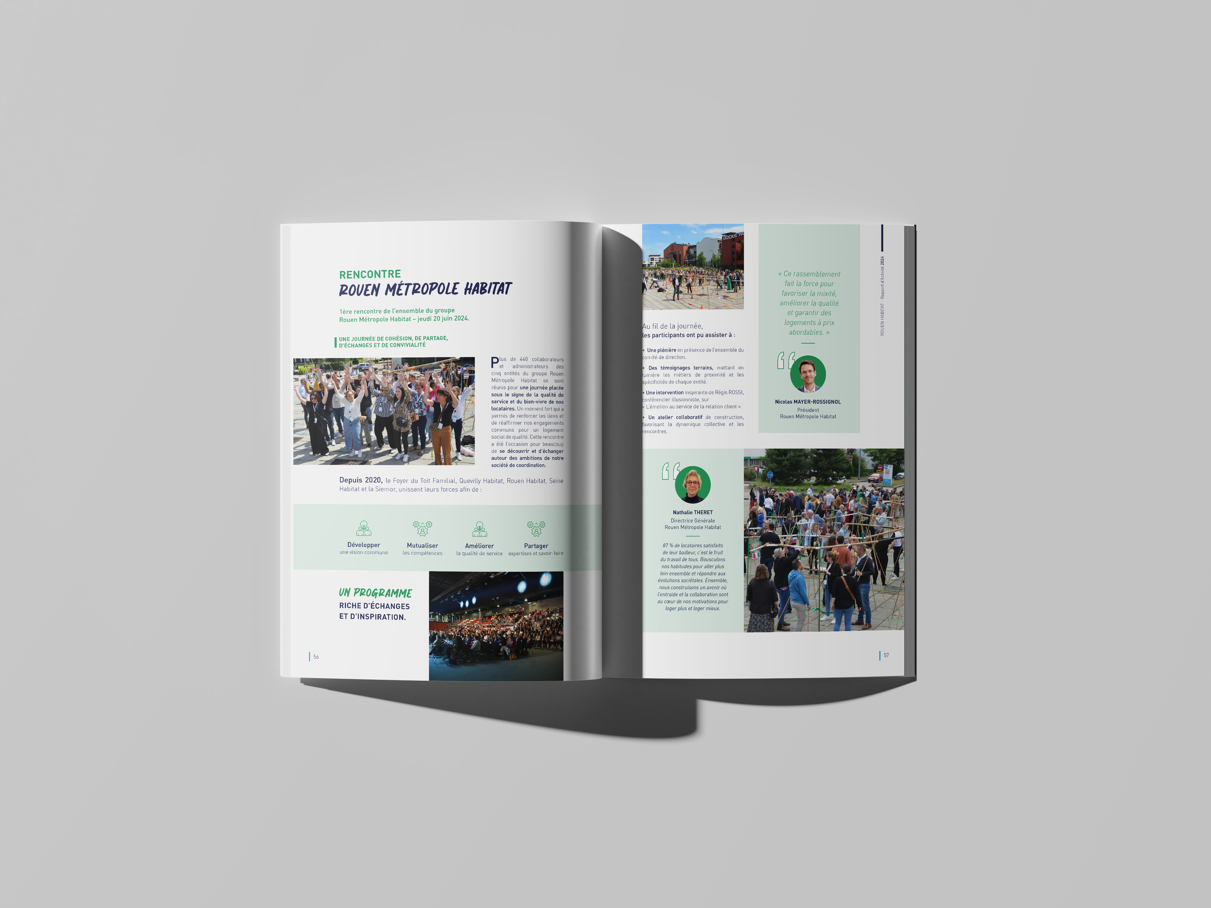 Rouen Habitat, acteur majeur du logement social à Rouen, m’a confié la création graphique et la mise en page de leur premier rapport d’activité. Leur objectif était de mettre en valeur leurs valeurs et engagements à travers un document à la fois informatif et visuellement attrayant.
